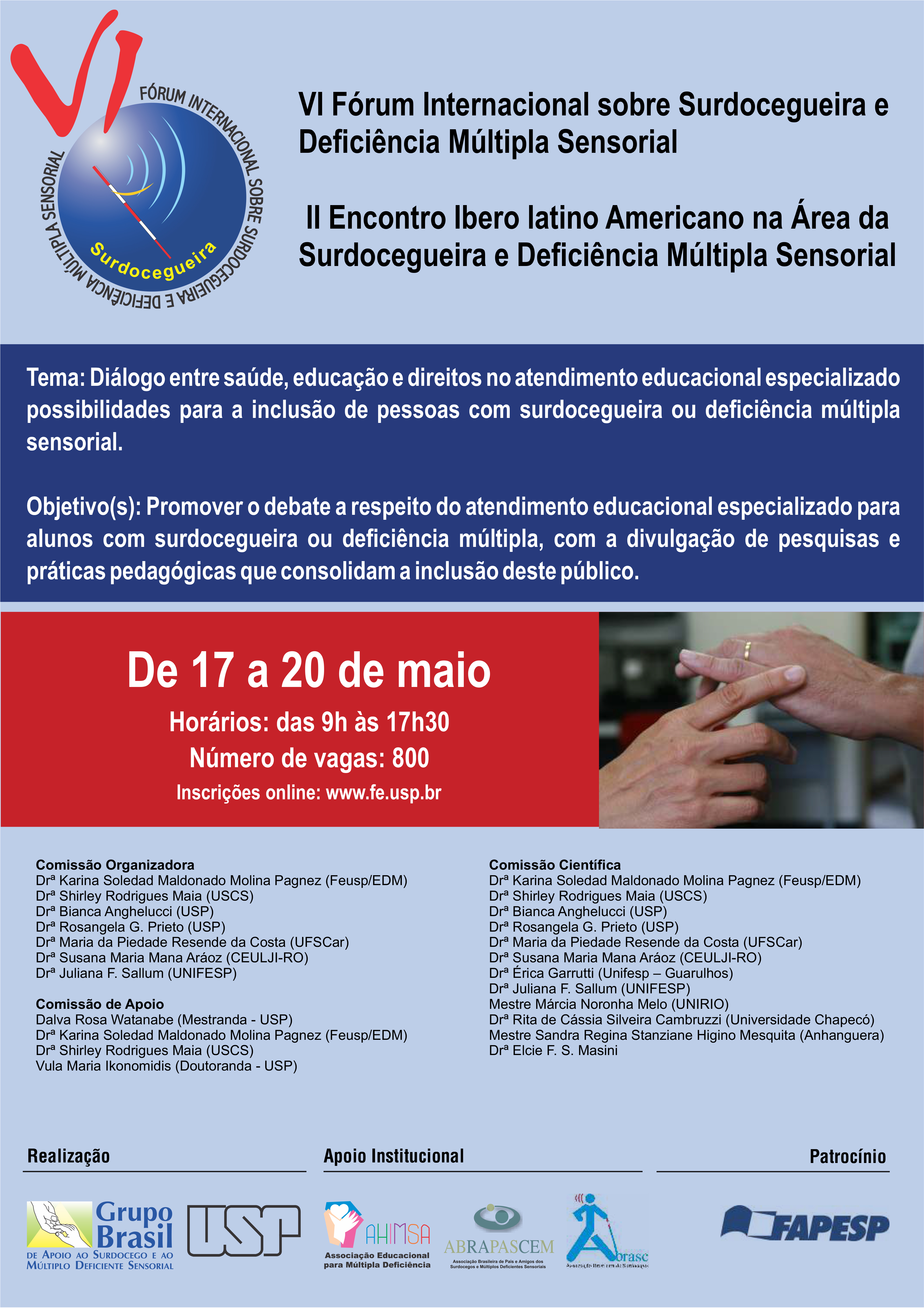 Notícias VI Fórum Internacional sobre Surdocegueira e Deficiência Múltipla Sensorial e II Encontro Ibero latino Americano na Área da Surdocegueira e Deficiência Múltipla Sensorial Por Rebrates   18 de abril de 2016 Comentários dos Leitores