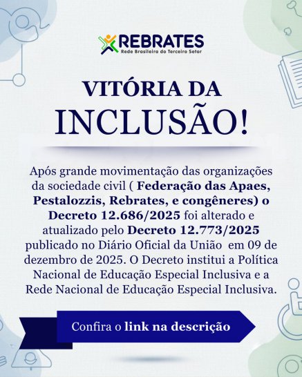 Após grande movimentação das organizações da sociedade civil ( Federação das Apaes, Pestalozzis, Rebrates, e congêneres) o Decreto 12.686/2025 foi alterado e atualizado pelo Decreto 12.773/2025 publicado no Diário Oficial da União em 09 de dezembro de 2025. O Decreto institui a Política Nacional de Educação Especial Inclusiva e a Rede Nacional de Educação Especial Inclusiva.